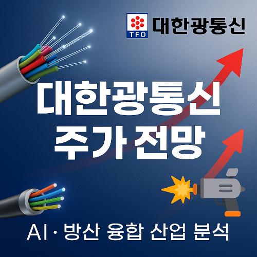 💡 대한광통신 주가 전망 — AI·방산 신사업의 이중 모멘텀📈 1. 서론: 레이저 무기체계와 AI 광케이블, 두 개의 성장축2025년 10월 현재, 대한광통신 주가 전망은 국내 증시에서 가장 주목받는 키워드 중 하나다.최근 1개월간 주가는 **1,760원까지 급등(최저가 416원 대비 +320%)**하며 52주 신고가를 경신했다.이 급등세의 배경에는 AI 데이터센터용 광케이블 수요 증가, 레이저 무기체계 공급 이슈, 그리고 미국 인프라 시장 진출 확대가 있다.대한광통신은 1974년 설립된 국내 유일의 광섬유·광케이블 일관생산 체제를 보유한 기업이다.과거 통신 인프라 중심 기업이었으나, 최근 AI 인프라 및 방위산업용 광케이블·레이저 모듈로 사업 영역을 확장하며 새로운 성장 스토리를 만들어가고 있다.?..
